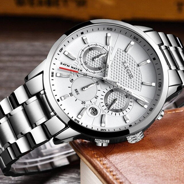 Exquisite Lige Men's Sports Quartz Watch Waterproof Steel Belt Double Eye Multi-function Watch Business Watch